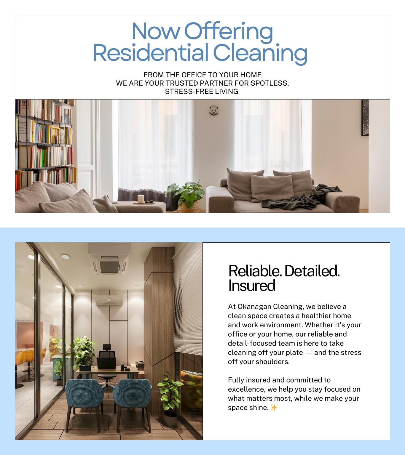 Daily, weekly, bi-weekly and monthly clean options. Evenings and weekends available.